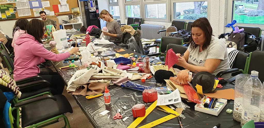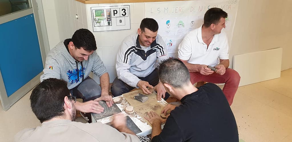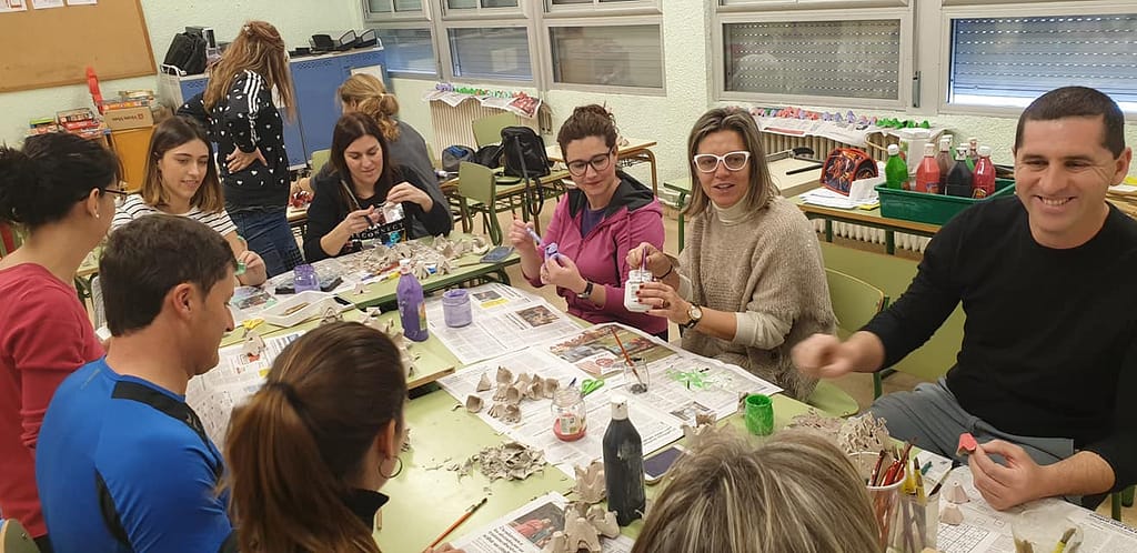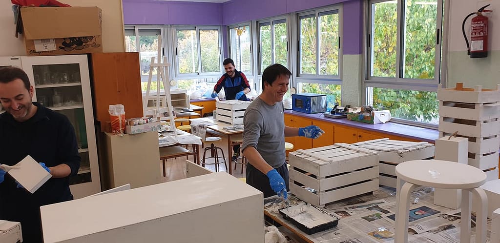 La fase más emocionante y que demuestra la importancia de crear espacios colaborativos y asociativos fue el momento de la propia convivencia donde se realizó el montaje del mobiliario, la creación de materiales para llenar el espacio, el pintado y reciclaje de varios muebles que estaban sin uso y la creación de nuevos muebles como el teatro infantil del aula.