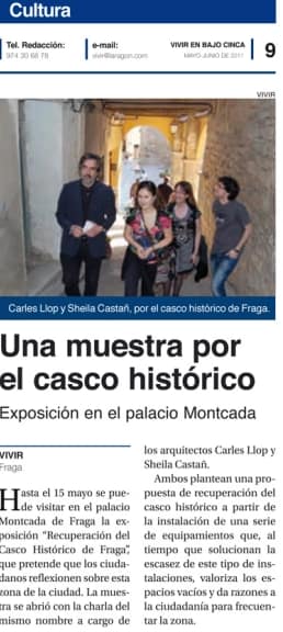 Esta conferencia sirve para inaugurar la exposición del mismo título, que pone al alcance de la Ciudad una reflexión realizada por la fragatina Sheila Castañ en torno a las posibilidades del Casco Histórico de Fraga que ha tomado la forma de Proyecto de Fin de Carrera coordinado por el también arquitecto Carles Llop. En él, se plantea una propuesta de recuperación del Casco Histórico de Fraga a partir de la instalación en el mismo de una serie de equipamientos que, al tiempo que solucionan la escasez de este tipo de instalaciones en el centro de la ciudad, valoriza los espacios vacíos que en él existen y da razones a la ciudadanía para frecuentar la zona.
