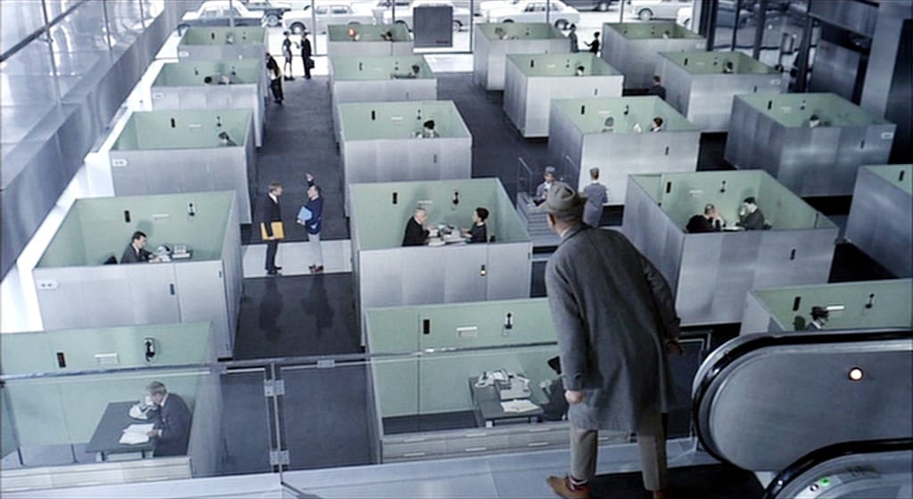 Monsieur Hulot intenta orientarse en un laberinto de oficinas donde se pierde dando zancadas de un cubo de cristal a otro, completamente desorientado. En su genial película “Playtime” veíamos lo absurdos que llegan a ser algunos interiores mientras los oficinistas amargados y circunspectos de aquel ministerio infinito cumplían sin chistar.