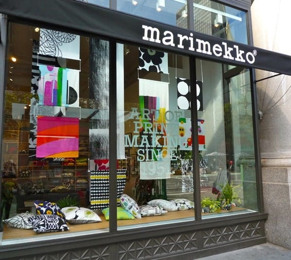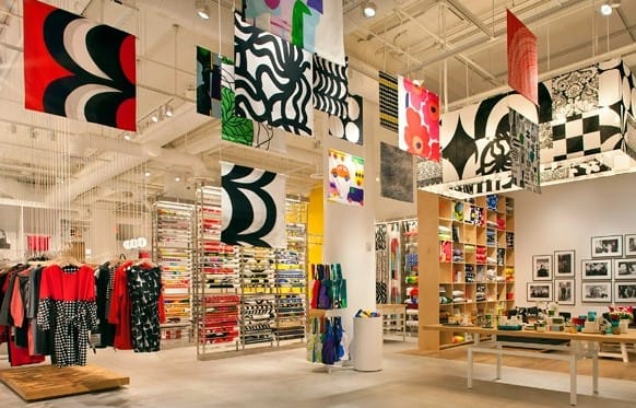 Cambiamos de tercio a tan solo dos pasos, y en el mismo bloque entramos en la flagship store de la marca finlandesa de tejidos y patrones MARIMEKKO en NYC. Un equilibrado mundo paralelo de formas y texturas que hablan un lenguaje propio, basando su interiorismo en una limpia arquitectura de inspiración nórdica (suelos de parquet, paredes blancas y mobiliario de madera clara) que curiosamente recuerda a los japoneses MUJI y que ofrece un envoltorio neutro como contrapunto perfecto donde el producto es el auténtico protagonista.