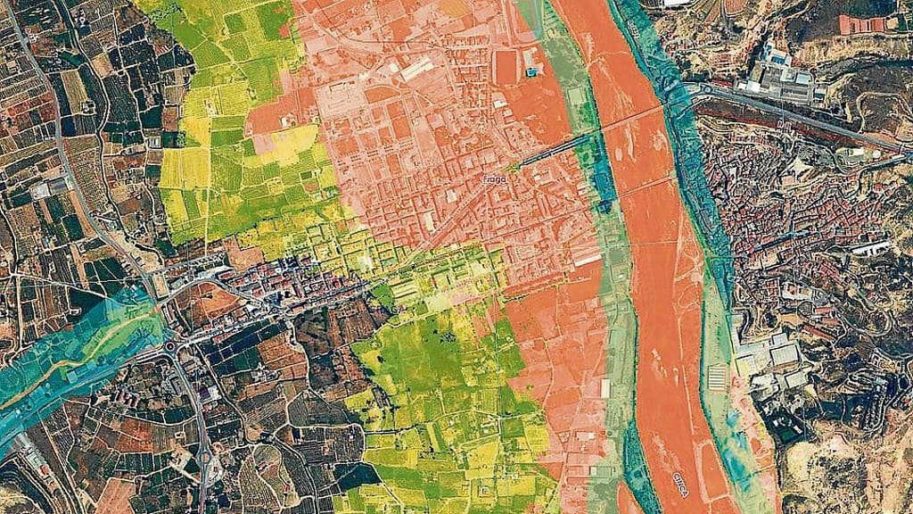 Otro condicionante fundamental para entender el tejido de nuestra ciudad, viene derivado del factor geográfico. Fraga se emplaza sobre dos tipos de topografía, el casco en pendiente y las afueras en zona inundable, separadas por una barrera natural que condiciona la futura evolución de la ciudad. Como podemos ver en la imagen extraida de zonas inundables, es el mismo rio el que obliga a polarizar todavía más la ciudad, dando como únicas opciones de desarrollo los barrios de Casco Histórico, Atarazanas o incluso antiguo Sabeco, o al otro lado del rio, la zona de camino y calle Alcabón.